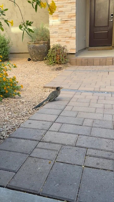 This isn’t the first time a roadrunner has found our door. Five years ago, one appeared at my sister Sharon’s home. Sharon named her Rosamunda, fed her dried mealworms, and before long, Rosamunda was knocking on her glass door with her beak, politely reminding Sharon when it was mealtime.